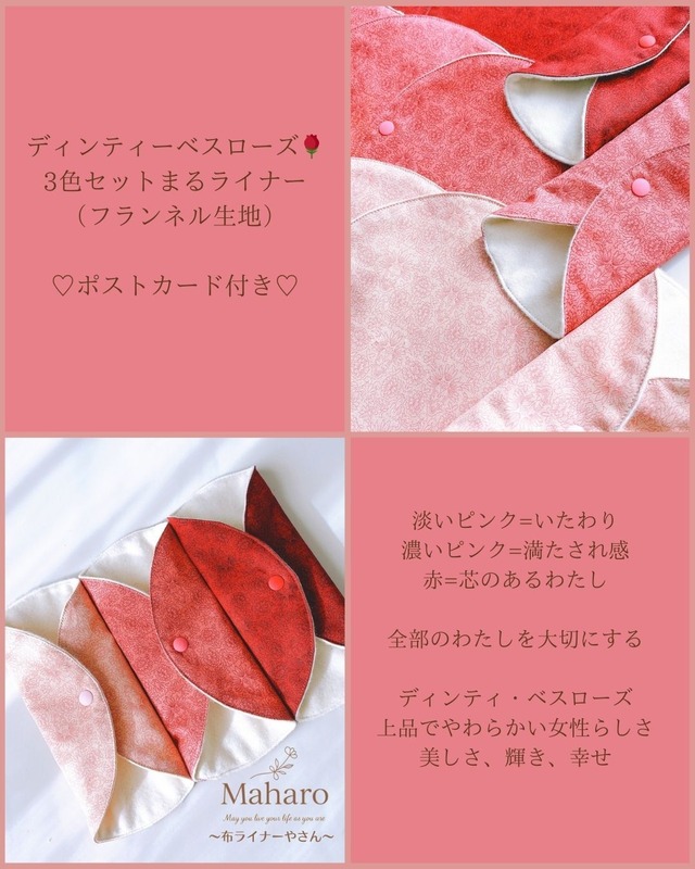 ディンティ・ベスローズ 上品でやわらかな女性らしさ 美しさ 輝き 幸せ 淡いピンク = いたわり 濃いピンク = 満たされ感 赤 = 芯のあるわたし やさしいわたしも 強いわたしも 揺れるわたしも ♡全部のわたしを、大切にする♡ 肌に触れる面には、 安心してお使いいただける GOTS認証のオーガニックコットン100%を使った、日本製のプレミアム・ネル生地です。 両面がふんわり起毛していて、 無漂白のやさしい生成り色。 肌当たりがとてもやわらかく、 ふんわりとあたたかく ほっとする安心感があります♡ ・おりもの用にも ・体の冷え対策に ・お肌にやさしく ・通気性よく ・蒸れにくく ・かぶれやニオイをやわらげ ・ふんわり心地いいつけ心地 ・生理が始まる前の女の子へ ママから贈る “小さな安心” 2枚構造になりますので 放水布は使用していません。 [サイズ〕 直径約:16cm [商品の構造] 肌面:フランネルオーガニッ クコットン100% デザイン面:綿100% ボタン:プラスチックスナップ [発送について] 商品の発送までに7日ほどいただきます。 ⭐︎漂白や染色などの薬品加工は施してありませんので、肌面につぶつぶの綿花のカスが付いております。お洗濯で自然と取れ、肌への影響はございませんのでご安心ください。 ⭐︎布の裁ち方により、それぞれ柄の出方が少しずつ違いますが、可愛く仕上がるようにカットしていますので、ご了承くださいませ。 ⭐︎天然素材使用のため、生地の性質上、お洗濯の際に縮みが生じる事がございます。